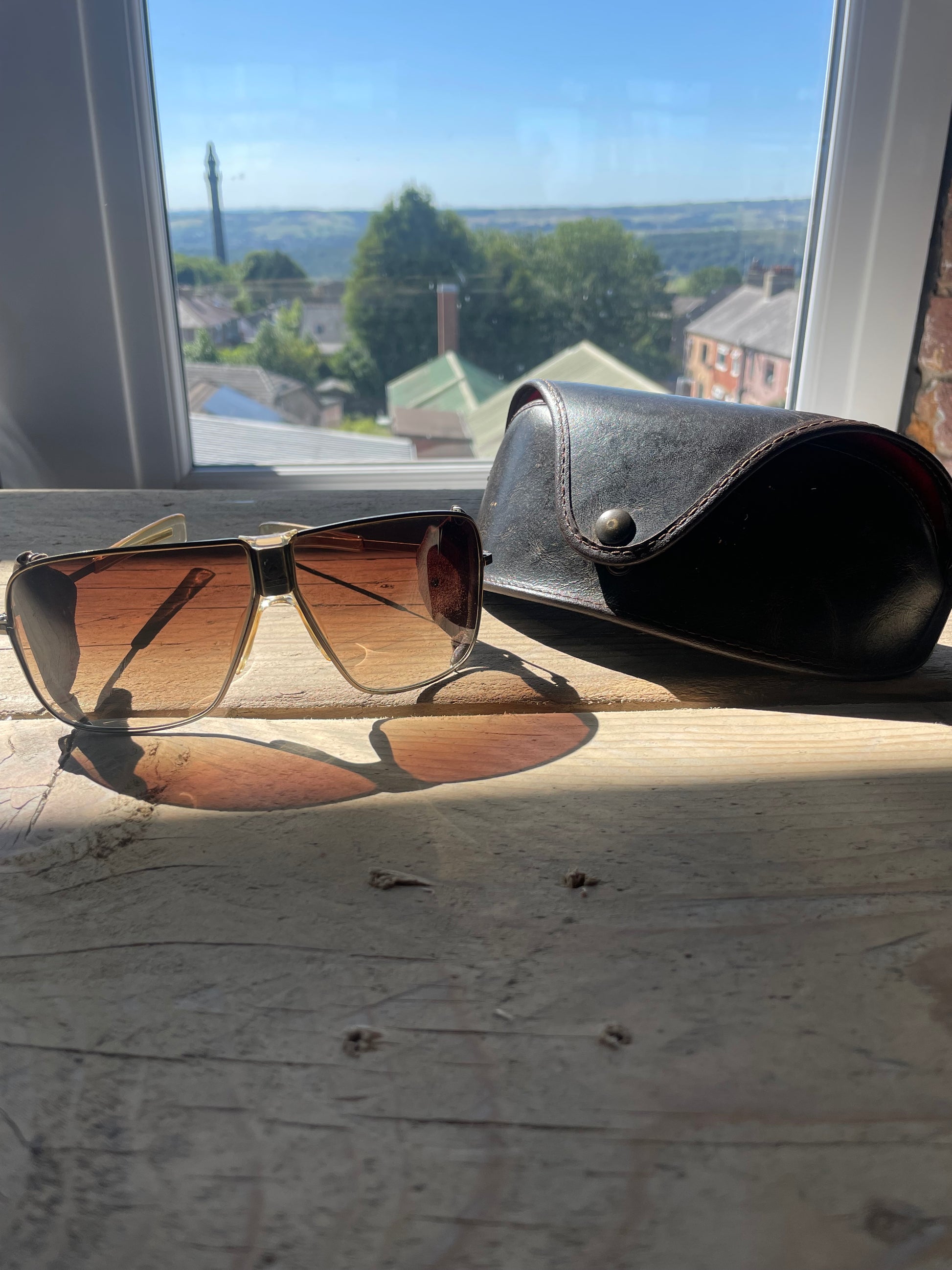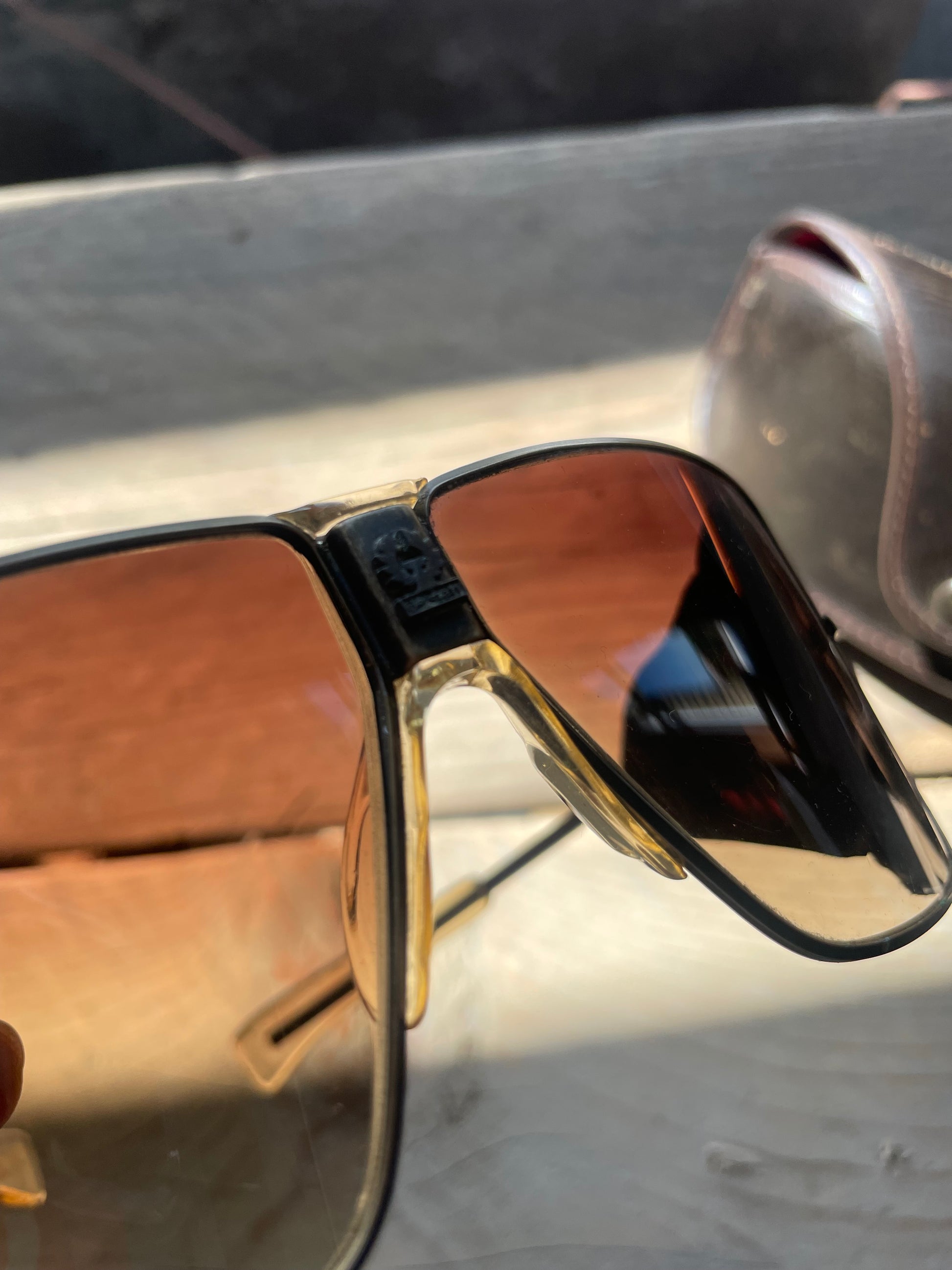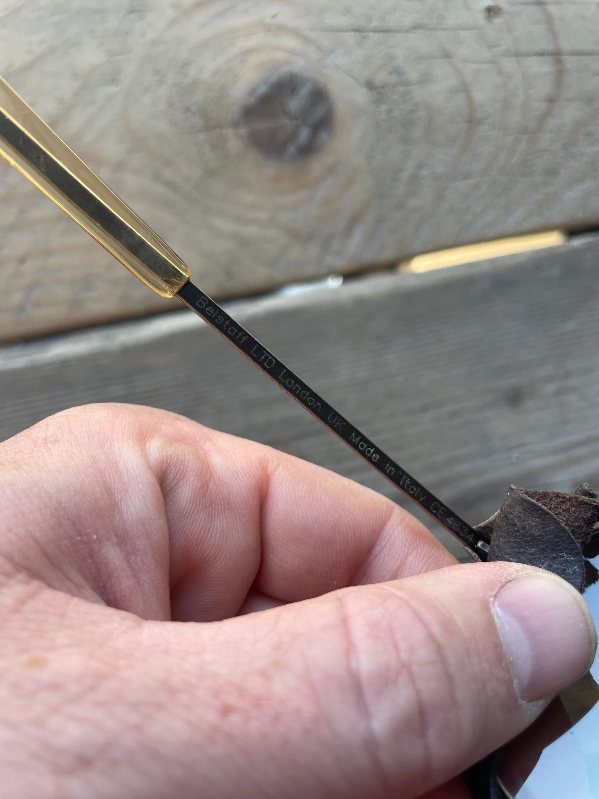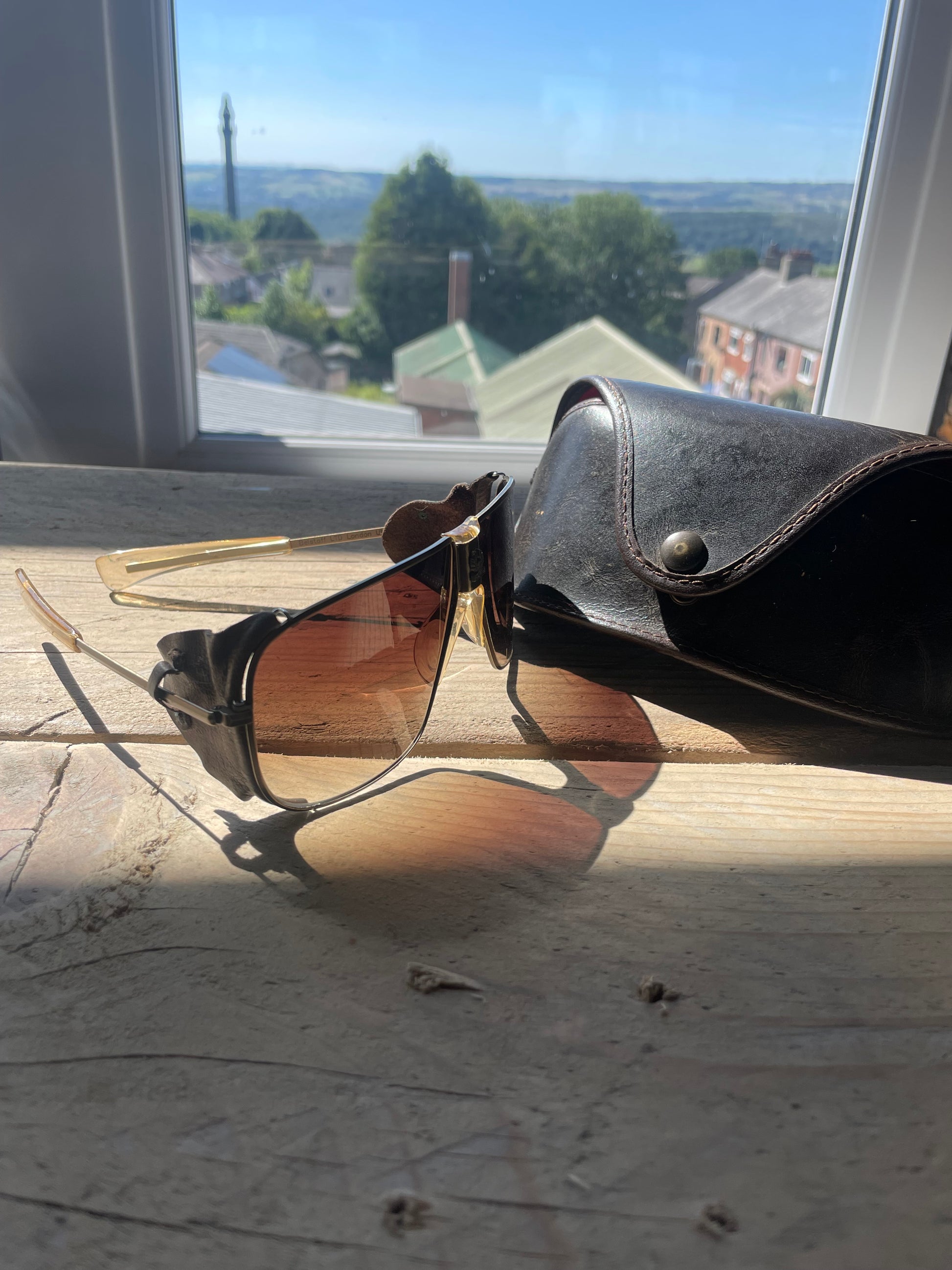 A Early 2000s pair of Belstaff Safari aviator sunglasses featuring leather side panels. Brown gradient lenses and Belstaff branding on the bridge.
